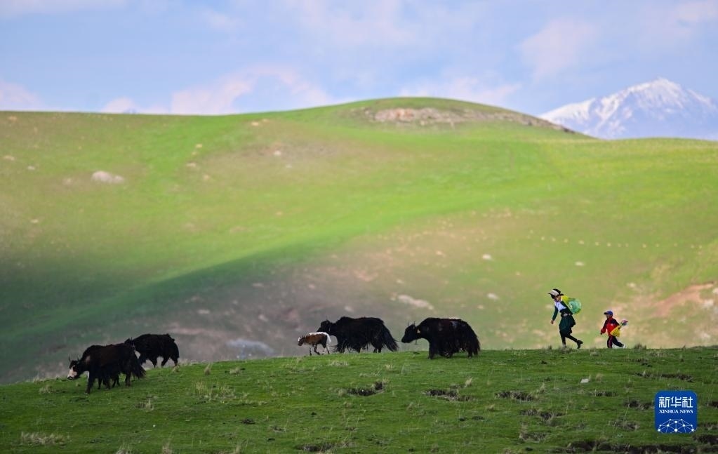 6月9日,在青海省黃南藏族自治州澤庫縣的高原草原上,當(dāng)?shù)啬撩裨诜拍痢? 新華社記者 張龍 攝