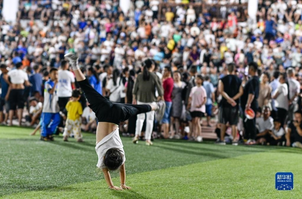 6月10日,演員在貴州“村超”足球比賽后表演民族舞蹈“多耶”,現(xiàn)場(chǎng)觀眾一起上場(chǎng)狂歡(無(wú)人機(jī)照片)。