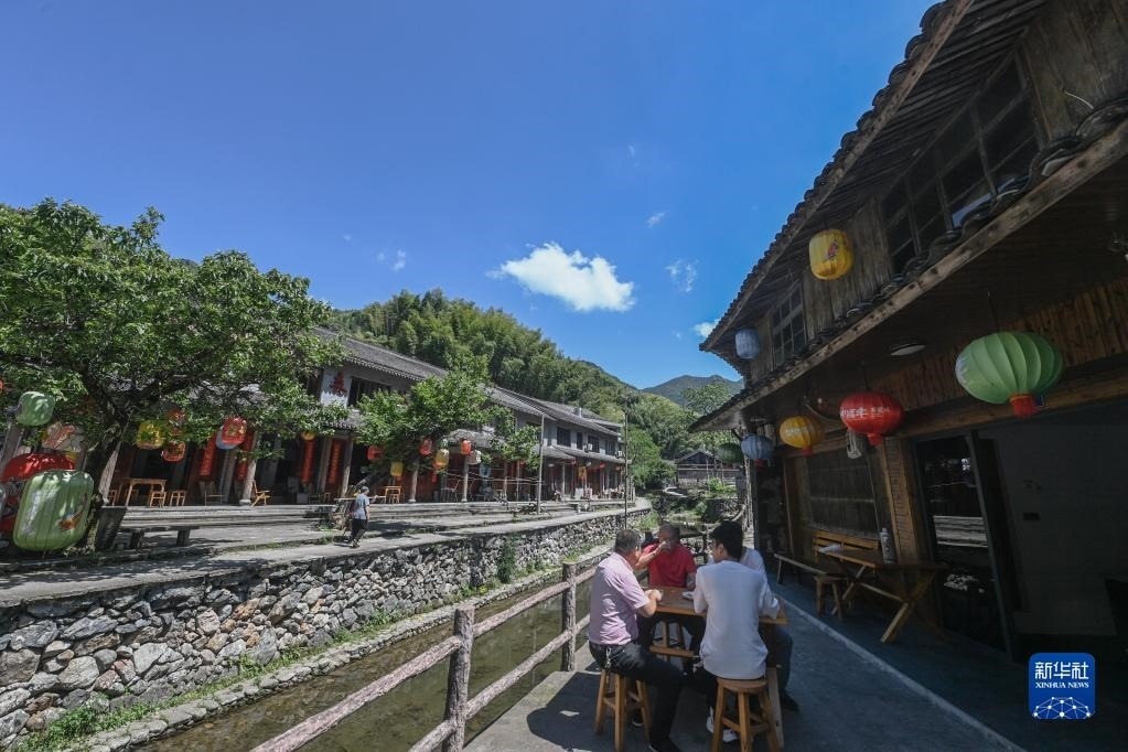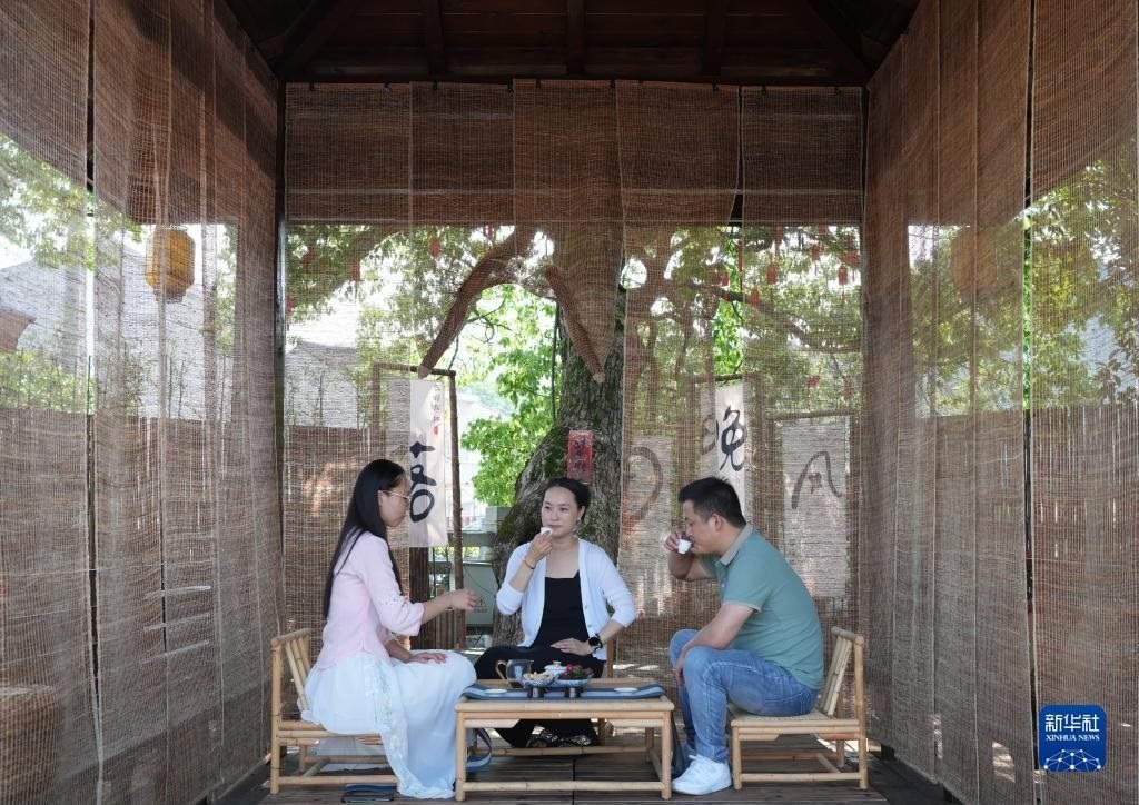 人們在浙江臺州黃巖區(qū)嶼頭鄉(xiāng)布袋坑村的溪水旁喝茶(5月30日攝)。近年來,嶼頭鄉(xiāng)堅持黨建引領,以全域旅游和美麗鄉(xiāng)村建設為重要抓手,引進文化創(chuàng)意團隊,為鄉(xiāng)村旅游注入更加年輕化的元素,推進特色民宿以及布袋山饅頭、溪坑魚等農(nóng)特產(chǎn)品的發(fā)展,帶動鄉(xiāng)村振興和百姓共富。新華社記者 徐昱 攝