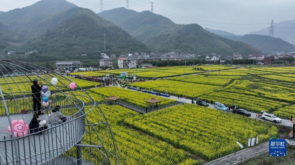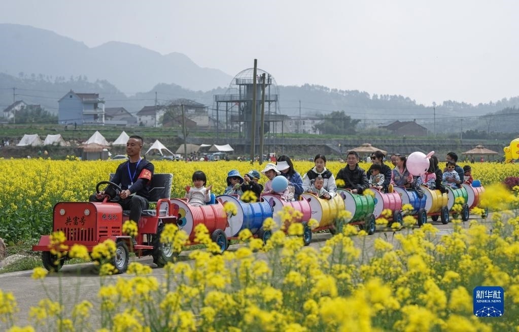 在浙江杭州臨安區(qū)青山湖街道郎家村“共富稻田”,游客乘坐田野小火車在油菜花地里感受春日美景(4月1日攝)。“共富稻田”定位多功能田園農(nóng)旅綜合體,陸續(xù)打造了妙哉花園、稻田觀光道、稻田餐廳、稻田茶吧等鄉(xiāng)村旅游特色節(jié)點,吸引城市居民前來體驗戶外農(nóng)田生活。新華社記者 徐昱 攝