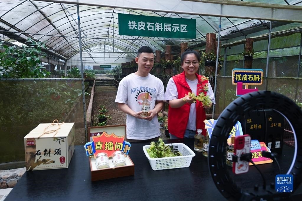 在浙江諸暨東白湖鎮(zhèn)的鐵皮石斛有機種植基地,東白湖鎮(zhèn)黨員志愿者(右)和基地負責人一起直播銷售鐵皮石斛花茶、鐵皮石斛酒等產(chǎn)品(6月8日攝)。近年來,東白湖鎮(zhèn)著力發(fā)展鐵皮石斛等特色農(nóng)業(yè)產(chǎn)業(yè),加快農(nóng)業(yè)數(shù)字化轉型,推進農(nóng)特產(chǎn)品交易服務中心、惠農(nóng)綜合平臺以及直播經(jīng)濟的發(fā)展。新華社記者 徐昱 攝
