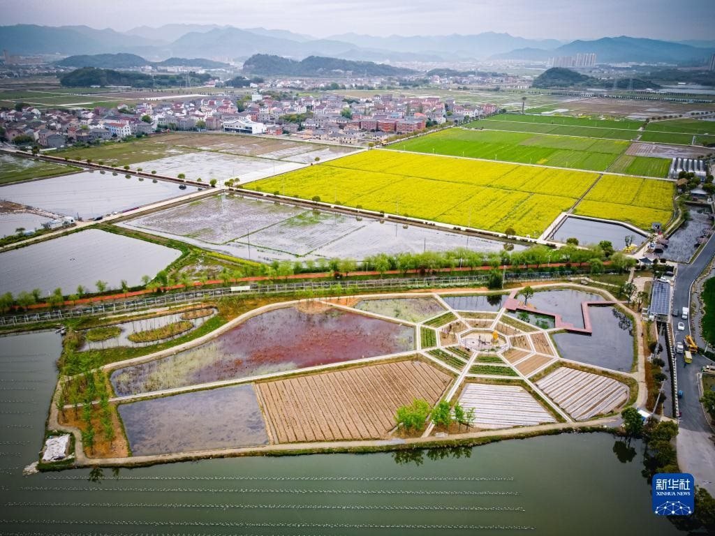 浙江諸暨楓橋鎮(zhèn)杜黃新村農(nóng)耕體驗研學基地(無人機照片,3月29日攝)。近年來,當?shù)赝瞥鍪喾N農(nóng)事特色體驗項目,著力打造“田上杜黃”這一文旅品牌。新華社記者 江漢 攝