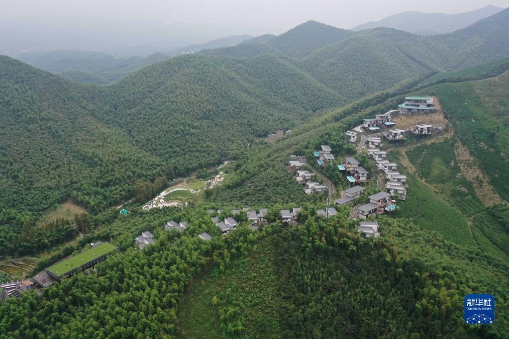 位于浙江湖州吳興區(qū)妙西鎮(zhèn)的“慧心谷”度假酒店(無人機照片,2020年10月3日攝)。附近妙山村的不少村民在這家山谷中的酒店就業(yè)。新華社記者 黃宗治 攝