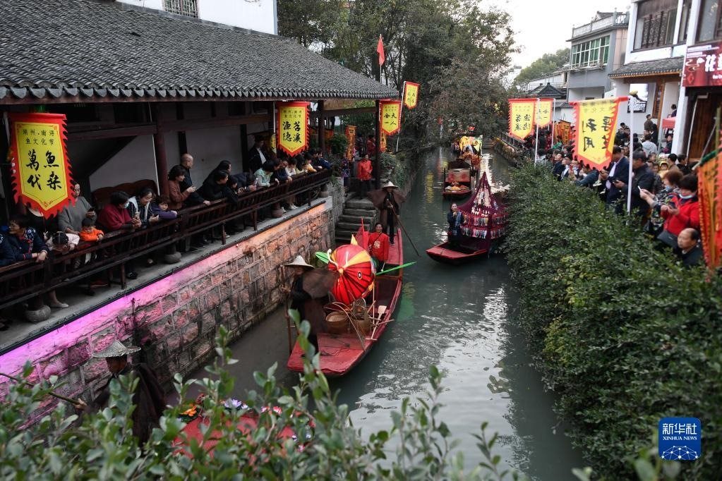 游客在浙江湖州南潯區(qū)和孚鎮(zhèn)荻港村觀看“水上曬秋”豐收慶典(2020年11月15日攝)。新華社記者 黃宗治 攝