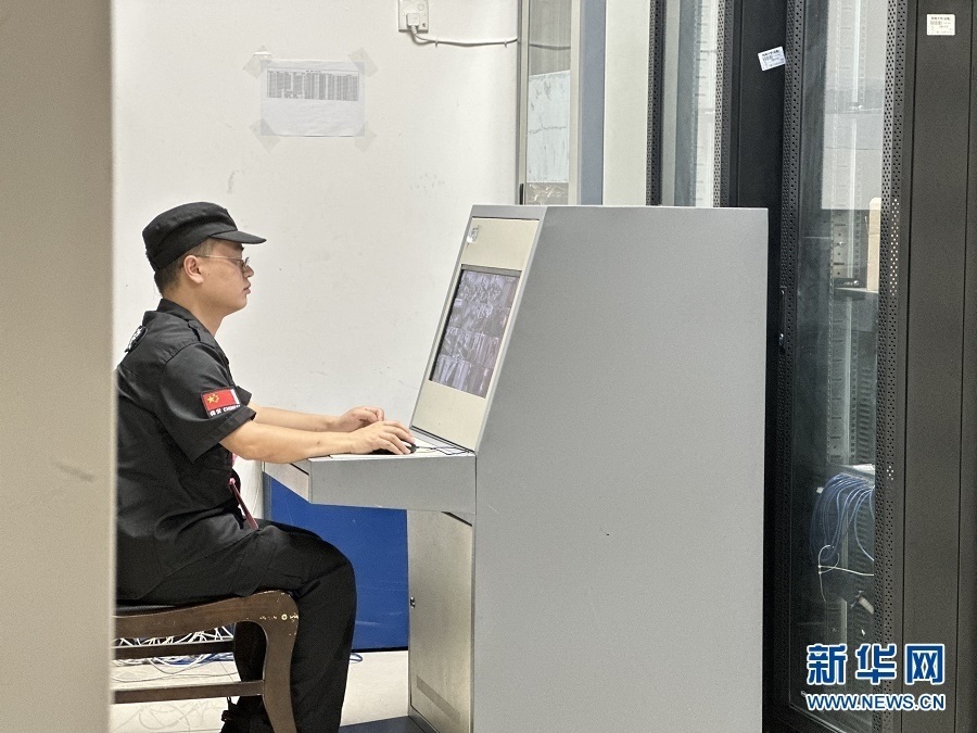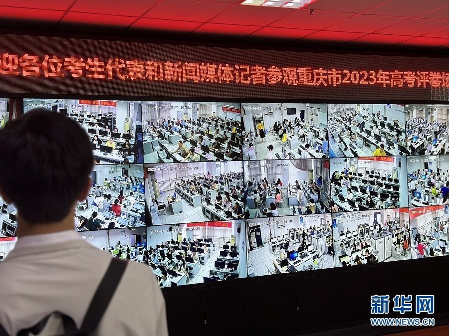 工作人員通過視頻實(shí)時(shí)監(jiān)控閱卷現(xiàn)場(chǎng)。新華網(wǎng) 彭浩然 攝