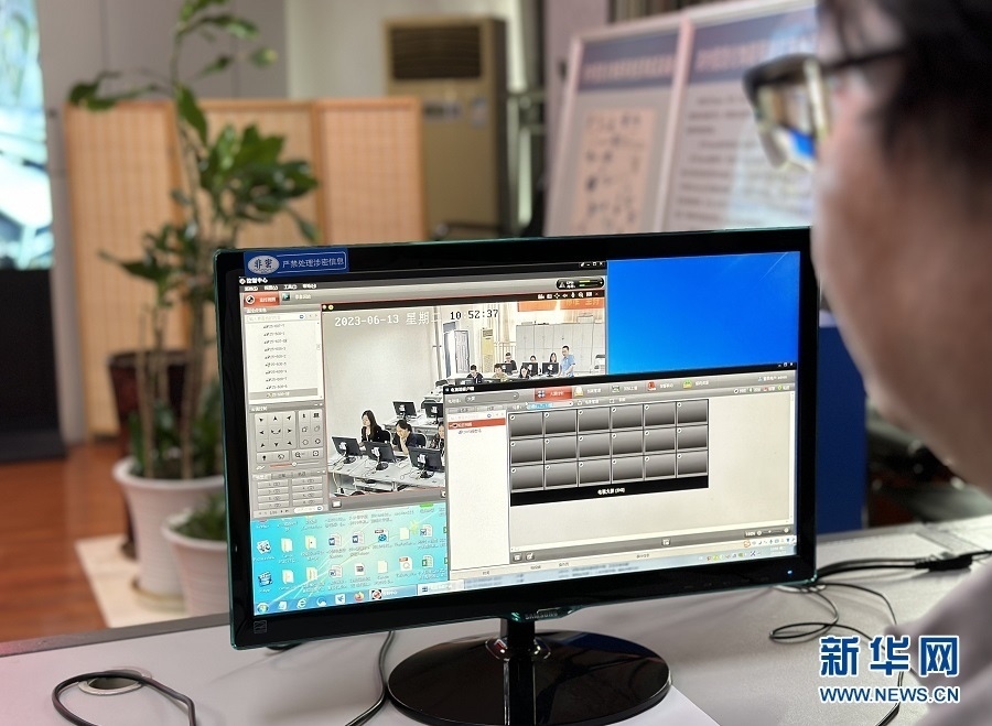 工作人員通過視頻查看閱卷現(xiàn)場(chǎng)情況。新華網(wǎng) 彭浩然 攝