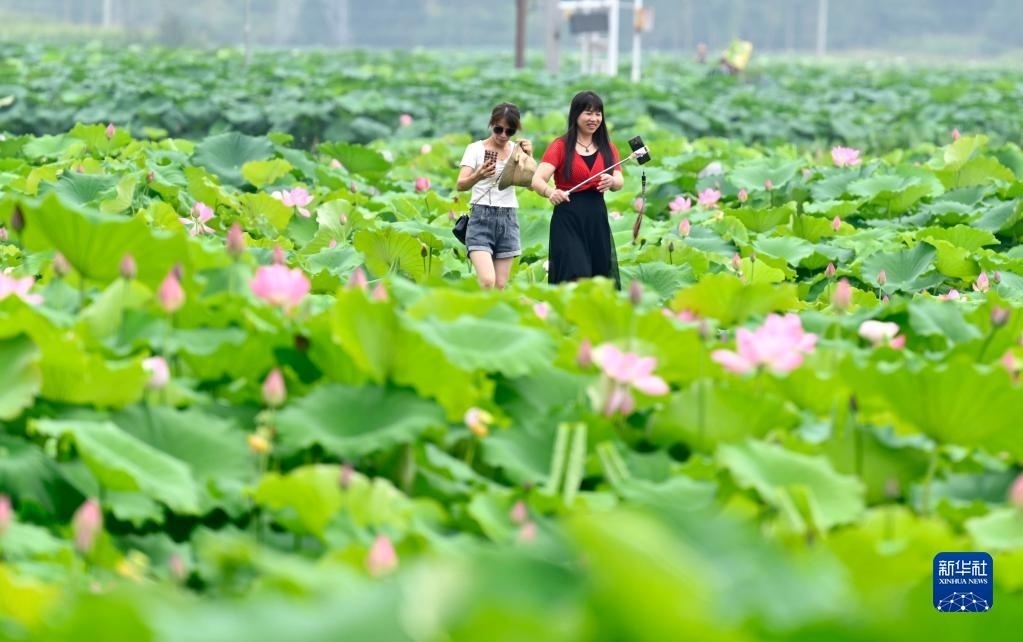時下,廣西柳州市柳江區(qū)百朋鎮(zhèn)萬畝荷塘里的各色荷花競相綻放,吸引游客前來賞花游玩。新華社發(fā)(黎寒池 攝)