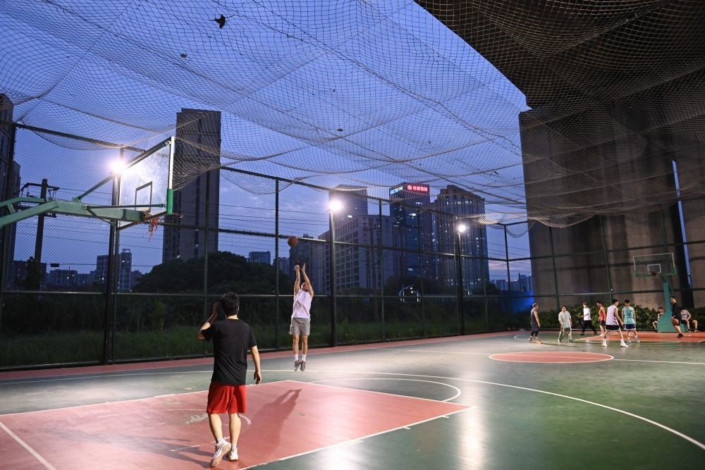 2022年9月20日,市民在位于高鐵橋下的錢江世紀(jì)城體育公園打籃球。在杭州,一批運動場館見縫插針地“嵌入”市民生活圈,城市空間的“邊角余料”正成為全民健身的“金角銀邊”。新華社記者 黃宗治 攝