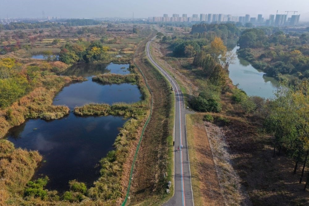 2022年11月12日,運動愛好者們在浙江省杭州市余杭區(qū)瓶窯鎮(zhèn)北湖草蕩生態(tài)濕地的健身游步道上參加健康跑比賽(無人機(jī)照片)。新華社記者 徐昱 攝