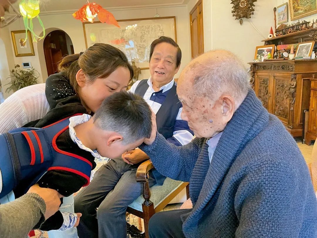 黃老看到天予甚為高興,美林請黃老摸摸兒子的頭,說讓黃老加持下,未來成為“小黃永玉”。黃老高興地摸著天予的頭,天予對黃老說:“我理發(fā)了”,這一句話把黃老逗笑了。