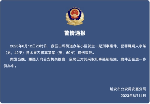 ·陜西延安一男子持水果刀將人捅傷致死,警方通報(bào)。