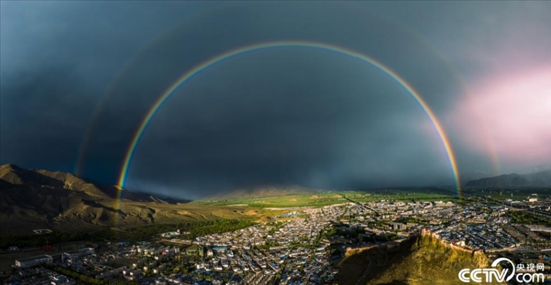 西藏日喀則:江孜宗山古堡上空現(xiàn)彩虹。