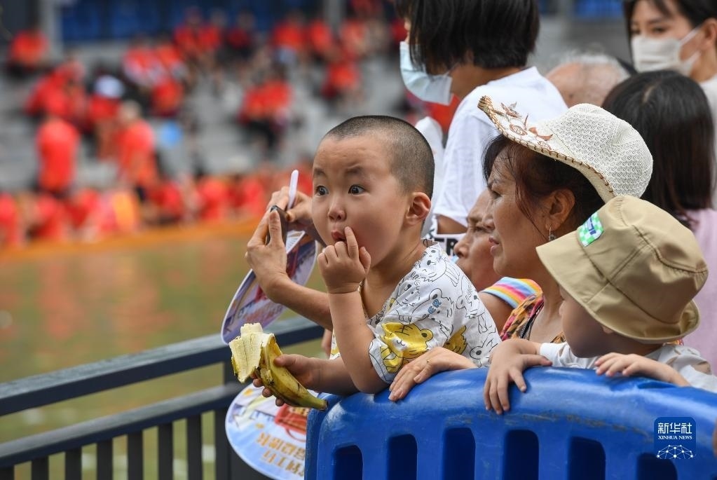 6月15日,小朋友被精彩的車陂龍舟賽吸引。
