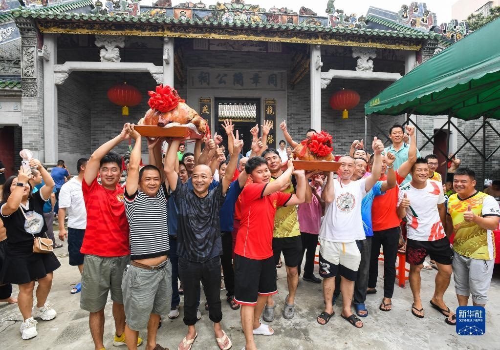 6月15日,2023年車陂龍舟競渡第一名“范陽簡”龍船會的成員們在家祠前抬著獎品燒豬慶祝。