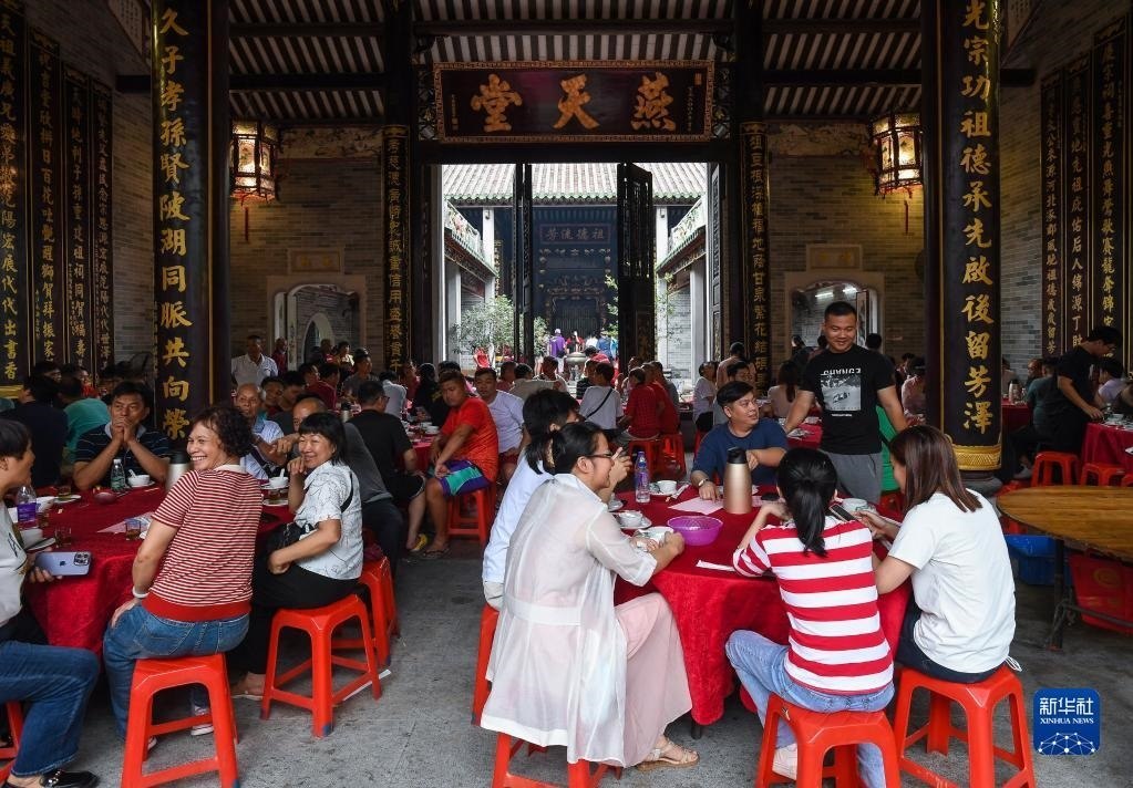 6月15日,2023年車陂龍舟競渡第一名“范陽簡”龍船會在簡氏家祠里擺下幾十桌龍船飯慶祝。