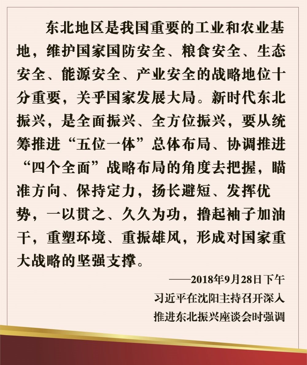他強(qiáng)調(diào),新時(shí)代新征程推動(dòng)?xùn)|北全面振興,要貫徹落實(shí)黨的二十大關(guān)于推動(dòng)?xùn)|北全面振興實(shí)現(xiàn)新突破的部署,完整準(zhǔn)確全面貫徹新發(fā)展理念,牢牢把握東北在維護(hù)國(guó)家“五大安全”中的重要使命,牢牢把握高質(zhì)量發(fā)展這個(gè)首要任務(wù)和構(gòu)建新發(fā)展格局這個(gè)戰(zhàn)略任務(wù),統(tǒng)籌發(fā)展和安全,堅(jiān)持目標(biāo)導(dǎo)向和問(wèn)題導(dǎo)向相結(jié)合,堅(jiān)持鍛長(zhǎng)板、補(bǔ)短板相結(jié)合,堅(jiān)持加大支持力度和激發(fā)內(nèi)生動(dòng)力相結(jié)合,咬定目標(biāo)不放松,敢闖敢干加實(shí)干,努力走出一條高質(zhì)量發(fā)展、可持續(xù)振興的新路子,奮力譜寫(xiě)東北全面振興新篇章。