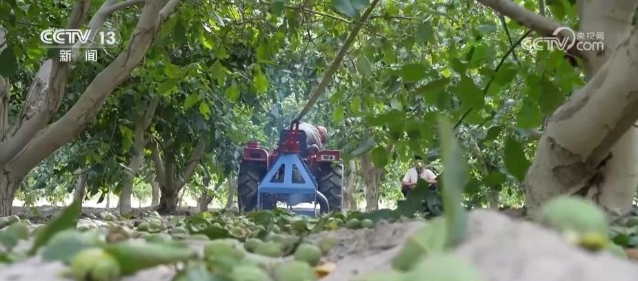 總臺(tái)記者 卜鵬:這里是位于新疆阿克蘇地區(qū)溫宿縣的一處核桃種植基地,這段時(shí)間正是當(dāng)?shù)睾颂页墒觳烧募竟?jié)。這些核桃樹上,一顆顆青綠渾圓的核桃掛滿枝頭,而在核桃樹底下,當(dāng)?shù)氐墓r(nóng)們正在抓緊撿收被抖落的核桃。為什么說是被抖落的核桃而不是被敲落的核桃?那是因?yàn)?,在?dāng)?shù)匾恍┓N植面積比較大的核桃基地里,當(dāng)?shù)氐墓r(nóng)會(huì)選擇利用農(nóng)業(yè)機(jī)械輔助抖動(dòng)樹干的方式來采收核桃。采收的時(shí)候,果農(nóng)們會(huì)把繩索捆綁在核桃樹上,負(fù)責(zé)機(jī)械操作的師傅會(huì)根據(jù)樹枝的粗細(xì)來掌握和控制抖動(dòng)的力度,這樣就能夠避免因?yàn)橛昧^猛而對樹枝產(chǎn)生傷害。經(jīng)過機(jī)器的搖擺,核桃就會(huì)接二連三落在地上,相比于人工采摘,機(jī)械采摘的方式效率會(huì)更高。