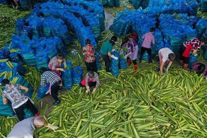 在浙江省麗水市景寧畬族自治縣大漈鄉(xiāng)大漈村茭白交易市場(chǎng),村民將新收割的茭白打包冷藏(2021年8月25日攝,無人機(jī)照片)。