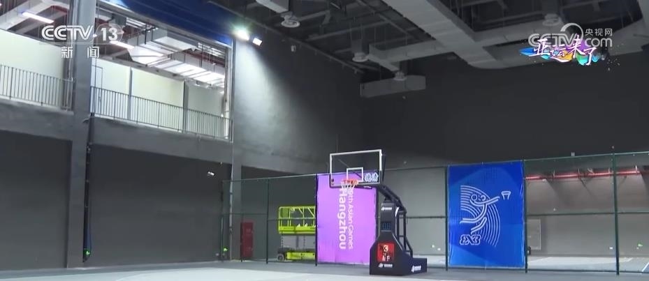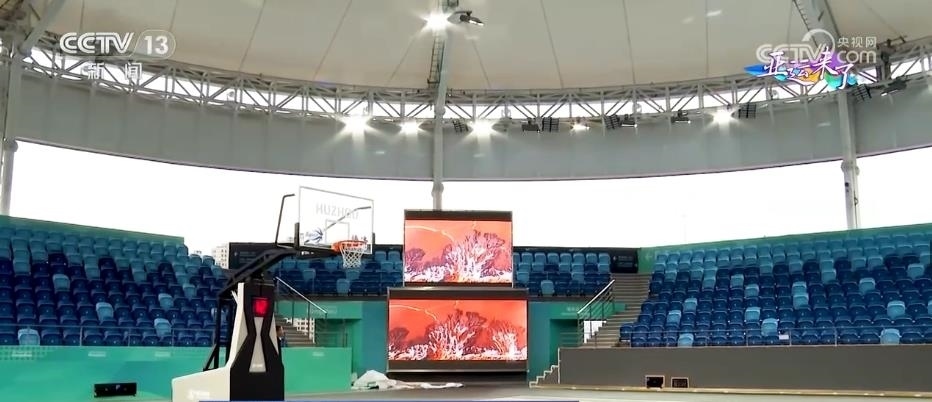 總臺央視記者 任梅梅:這里就是位于浙江德清的此次杭州亞運會三人制籃球項目的比賽場館。整個場館是鋼結構的建筑,正式比賽場地位于整個建筑的屋頂。這里可容納1009名觀眾現(xiàn)場觀賽,在場地的中央吊頂處,還有4臺非常清晰的顯示屏,屆時將實時播出賽場情況。三人制籃球比賽場地為15米×11米,不到常規(guī)籃球場的一半。