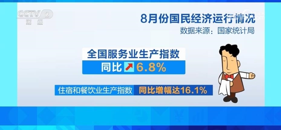 服務(wù)業(yè)較快增長,8月份,全國服務(wù)業(yè)生產(chǎn)指數(shù)同比增長6.8%。其中,住宿和餐飲業(yè)依然保持較快增長,生產(chǎn)指數(shù)同比增幅達到16.1%。