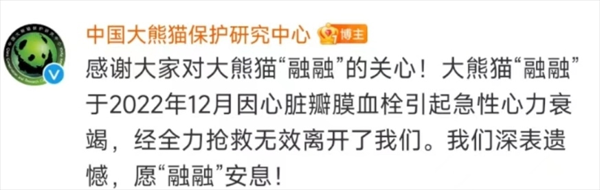 大熊貓“融融”于2022年12月因心臟瓣膜血栓引起急性心力衰竭,經(jīng)全力搶救無(wú)效離開(kāi)了我們。我們深表遺憾,愿“融融”安息!