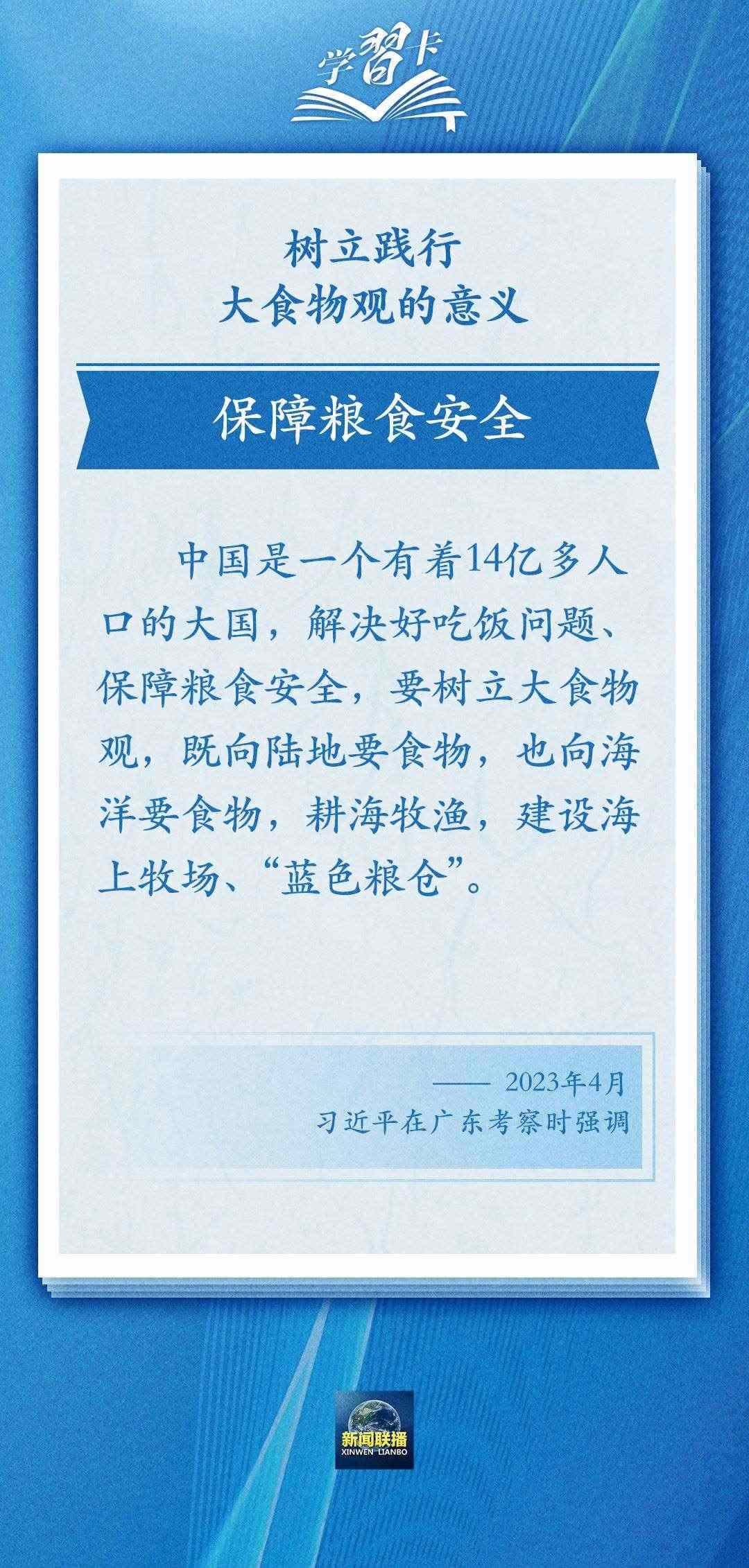 今年4月,總書記在廣東湛江考察時指出,要樹立大食物觀,既向陸地要食物,也向海洋要食物。前不久,總書記主持召開新時代推動?xùn)|北全面振興座談會強調(diào),踐行大食物觀,把農(nóng)業(yè)建成大產(chǎn)業(yè)。