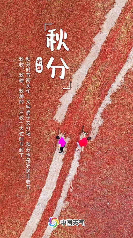 “秋分時節(jié)兩頭忙,又種麥子又打場。”秋分既意味著豐收的喜悅,也是耕種的標志。此時正是秋收、秋耕和秋種的“三秋”生產(chǎn)期,需重點防范初霜凍、華西秋雨、寒露風、大霧等天氣對農(nóng)業(yè)生產(chǎn)方面可能造成的不利影響。