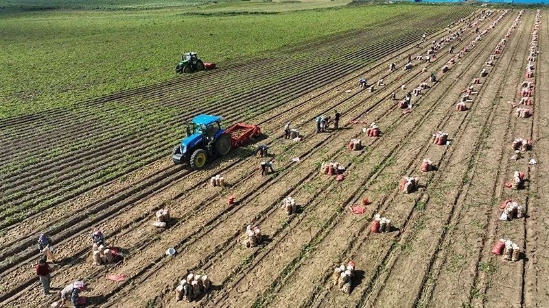 △9月3日,河北省圍場滿族蒙古族自治縣御道口鎮(zhèn)御道口村一家馬鈴薯種植合作社社員在收獲馬鈴薯。