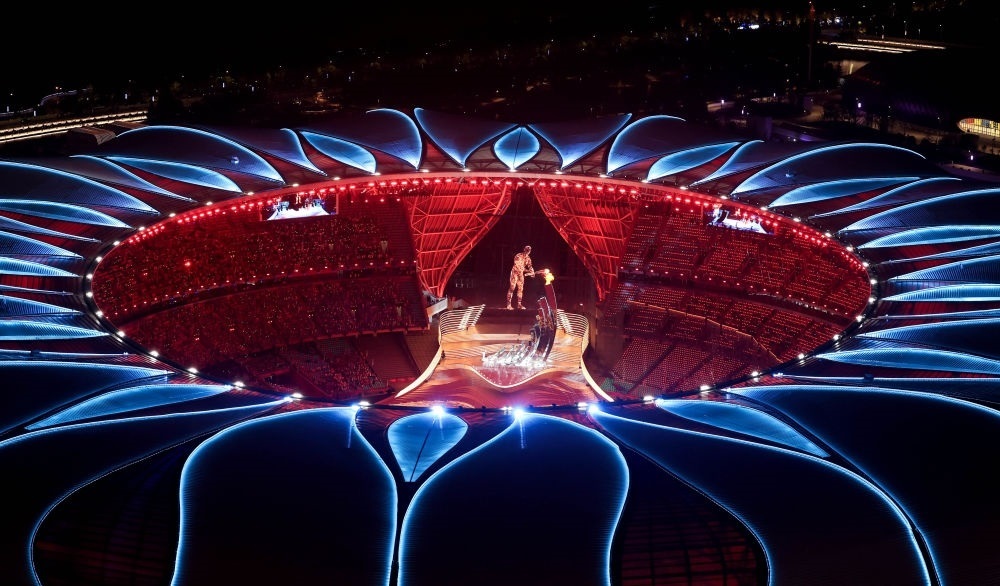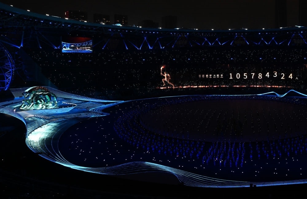 中國農(nóng)歷秋分節(jié)氣,杭州奧體中心體育場“大蓮花”燈光璀璨,萬涓成水,奔涌成潮?!皵?shù)字火炬手”與游泳運(yùn)動員汪順共同點(diǎn)燃了象征亞洲大團(tuán)結(jié)的體育之火,杭州第十九屆亞運(yùn)會開幕。