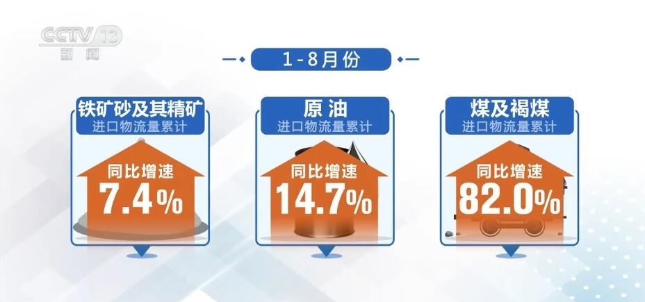 從進口來看,隨著內(nèi)需改善,進口物流也呈現(xiàn)量價回升。1—8月份進口物流總額同比增長14.4%,增速持續(xù)回升。從產(chǎn)品結構看,原材料等大宗商品進口增速有所加快,鐵礦砂及其精礦、原油、煤及褐煤進口物流量累計同比增速分別為7.4%、14.7%、82.0%。