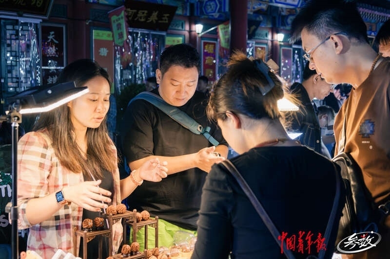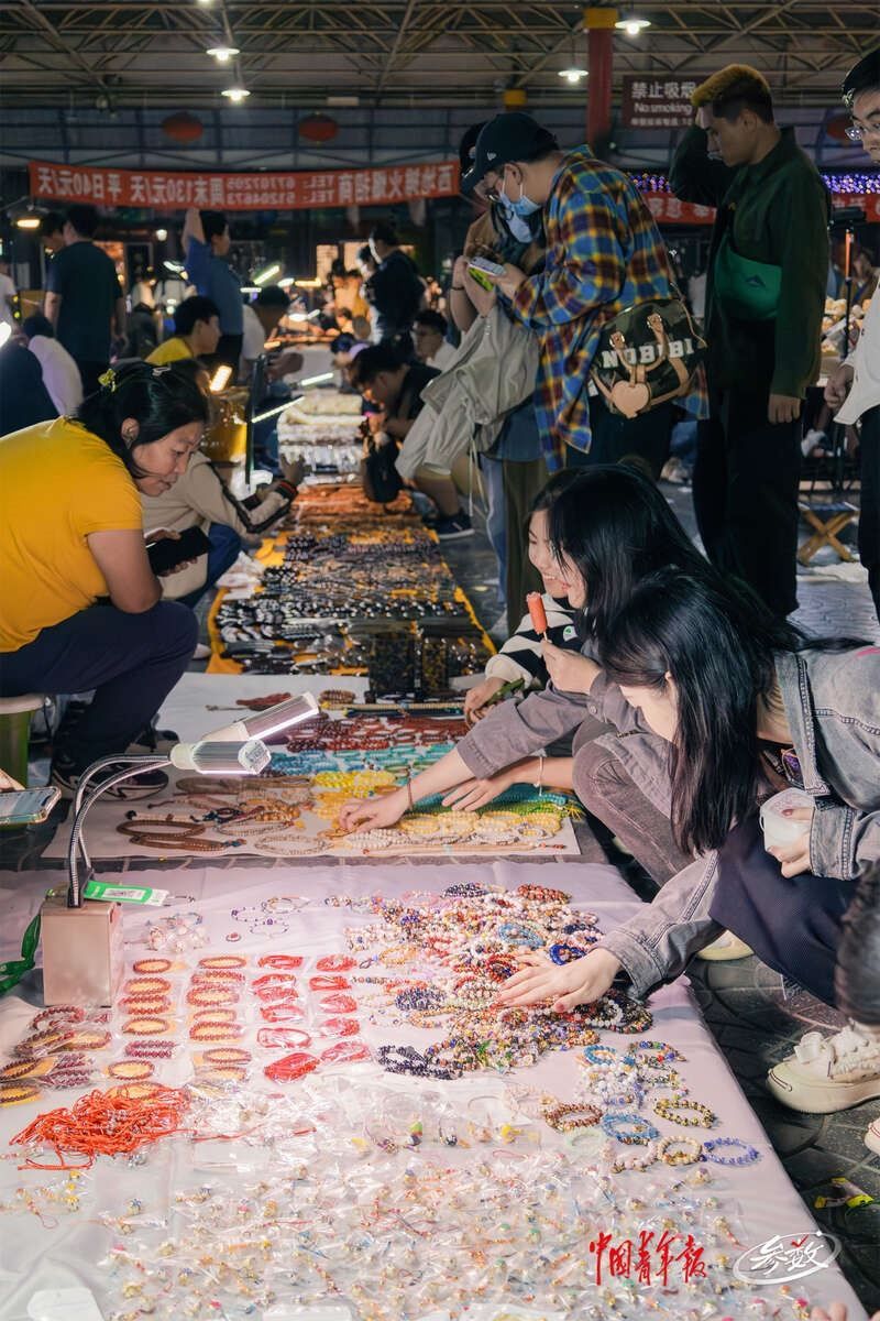 夜幕降臨,北京潘家園舊貨市場內(nèi)的周三夜場開啟,攤位上亮起了一盞盞照明的小燈,很多年輕人正在攤位前選購商品。實習生 邱嵐/攝