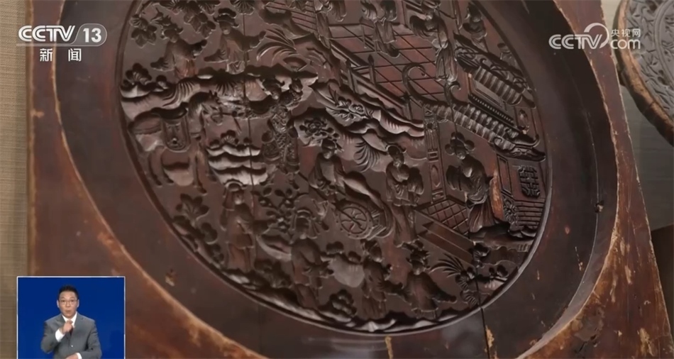 總臺(tái)記者 羅子瑛:瞧,我發(fā)現(xiàn)的這塊月餅?zāi)>咦龀鰜淼脑嘛炛睆侥軌蜻_(dá)到五六十公分,上面雕刻的花紋記錄了一位新科狀元回家為母親祝壽的場(chǎng)景??梢哉f月餅這樣一種食物,是用最樸素的方式記錄了人們的美好生活。