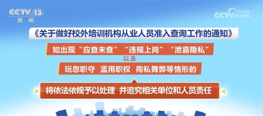 此外,《通知》強調嚴明查詢管理責任。各級教育部門和相關主管部門、校外培訓機構及其工作人員應履行準入查詢的法定職責,如出現(xiàn)“應查未查”“違規(guī)上崗”“泄露隱私”以及玩忽職守、濫用職權、徇私舞弊等情形的,將依法依規(guī)予以處理,并追究相關單位和人員責任。