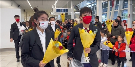 “鏗鏘玫瑰,中國(guó)加油!”當(dāng)中國(guó)隊(duì)球員走入國(guó)際到達(dá)大廳后,人群中發(fā)出整齊的助威聲。球迷們、孩子們紛紛把鮮花送給隊(duì)員們,有的與她們合影留念。當(dāng)看到主教練水慶霞走過(guò)來(lái),大家非常熱情,把水指導(dǎo)圍在中間,送上鮮花,致以問(wèn)候。
