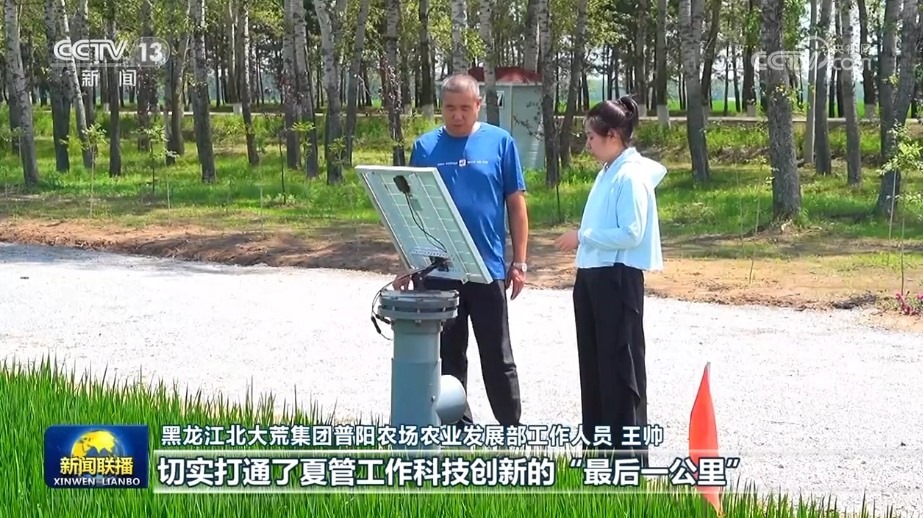 在北大荒普陽農(nóng)場第四管理區(qū)的水稻種植地塊,一套集災(zāi)情氣象、土壤墑情、病蟲害和苗情長勢監(jiān)測于一體的農(nóng)情監(jiān)測設(shè)備,正在24小時不間斷地對水稻生長進行全面監(jiān)控。