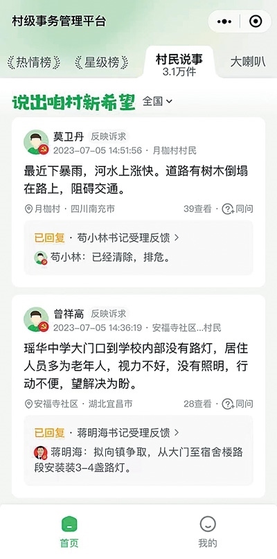 “老百姓把遇到的問題發(fā)布,我們看到后及時回復(fù)、解決,大大提高了工作效率?!笔孳娬f,他已經(jīng)養(yǎng)成習慣,每天都會看看村民在小程序說了啥事。