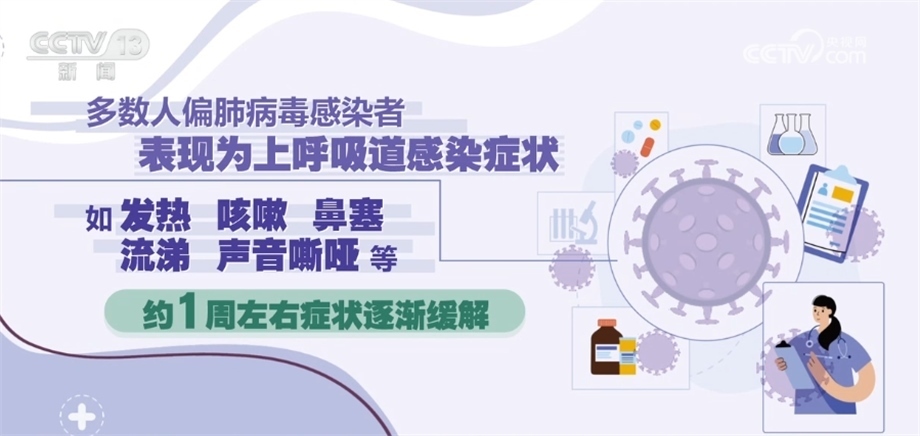 《人偏肺病毒感染診療方案(2023年版)》指出,人偏肺病毒感染者是主要傳染源。從潛伏期末到急性期都有傳染性。主要通過飛沫和密切接觸傳播,也可以通過接觸被病毒污染的物品間接傳播。人偏肺病毒人群普遍易感,在5歲以下兒童、老年人和免疫功能低下的人群中更為多見,潛伏期為3天—9天,多為3天—6天。多數(shù)人偏肺病毒感染者表現(xiàn)為上呼吸道感染癥狀,如發(fā)熱、咳嗽、鼻塞、流涕、聲音嘶啞等,約1周左右癥狀逐漸緩解。鑒于目前尚無證據(jù)證明有對人偏肺病毒有效的特異性抗病毒藥物,不建議使用抗病毒藥物進行治療。避免盲目或不恰當使用抗菌藥物,尤其是聯(lián)合使用廣譜抗菌藥物。