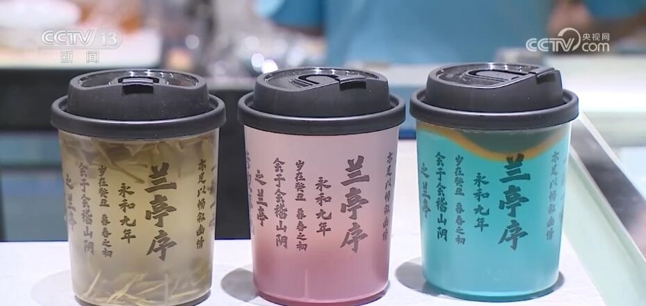 唯美的詩(shī)詞也成為了文創(chuàng)產(chǎn)品的創(chuàng)意之源。這杯文創(chuàng)茶飲的杯身上就印著王羲之名作《蘭亭集序》的部分佳句,吸引了不少年輕消費(fèi)者。
