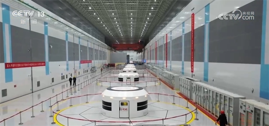 ?????? 國網(wǎng)新源河北豐寧抽水蓄能有限公司維護(hù)部副主任 劉金棟:機(jī)組的兩頭分別通過管道連接著一上一下兩個(gè)水庫,簡單而言,發(fā)電有富裕的時(shí)候,抽水蓄能電站用多余的電將水從低處抽到高處,將電能轉(zhuǎn)化為水的勢能,在用電高峰時(shí)再通過發(fā)電將水的勢能轉(zhuǎn)化為電能,輸回到電網(wǎng)中供大家使用,這一充一放,讓新能源存得住、用得著。
