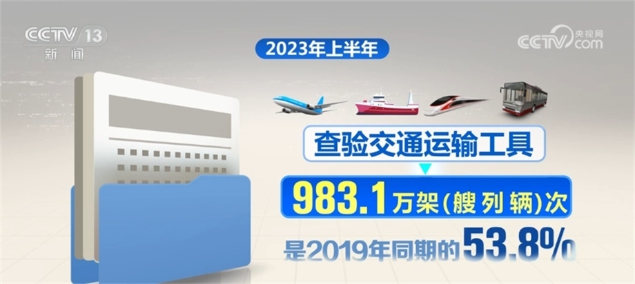 據國家移民管理局統(tǒng)計,2023年上半年,全國移民管理機構共查驗出入境人員1.68億人次,是2019年同期的48.8%,其中內地居民8027.6萬人次,港澳臺居民7490.3萬人次,外國人843.8萬人次(不含邊民);查驗交通運輸工具983.1萬架(艘、列、輛)次,是2019年同期的53.8%,其中,飛機20.4萬架次、船舶19.1萬艘次、火車4.4萬列次、汽車939.2萬輛次。