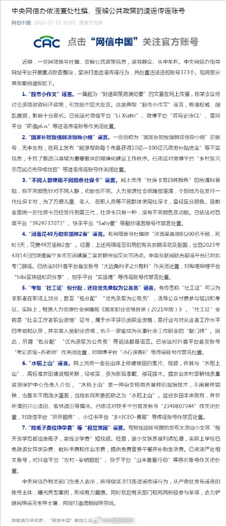 ·中央網(wǎng)信辦查處杜撰歪解公共政策造謠傳謠賬號,通報典型案例,共處置違法違規(guī)賬號373個。
