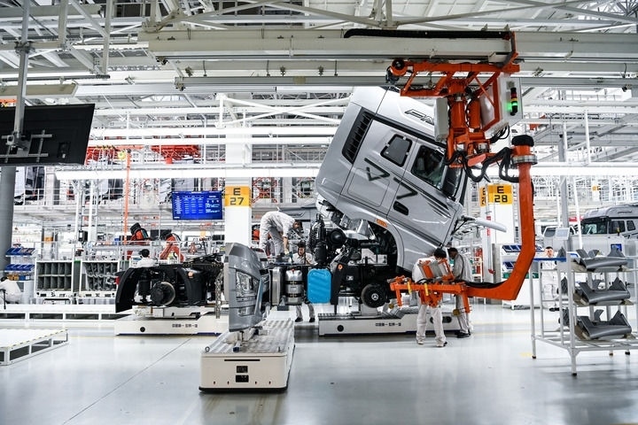 在位于吉林長(zhǎng)春的一汽解放汽車(chē)有限公司J7智能工廠(chǎng)內(nèi),工人在AGV(搬運(yùn)機(jī)器人)上裝配車(chē)輛(2023年6月12日攝)。新華社記者 顏麟蘊(yùn) 攝