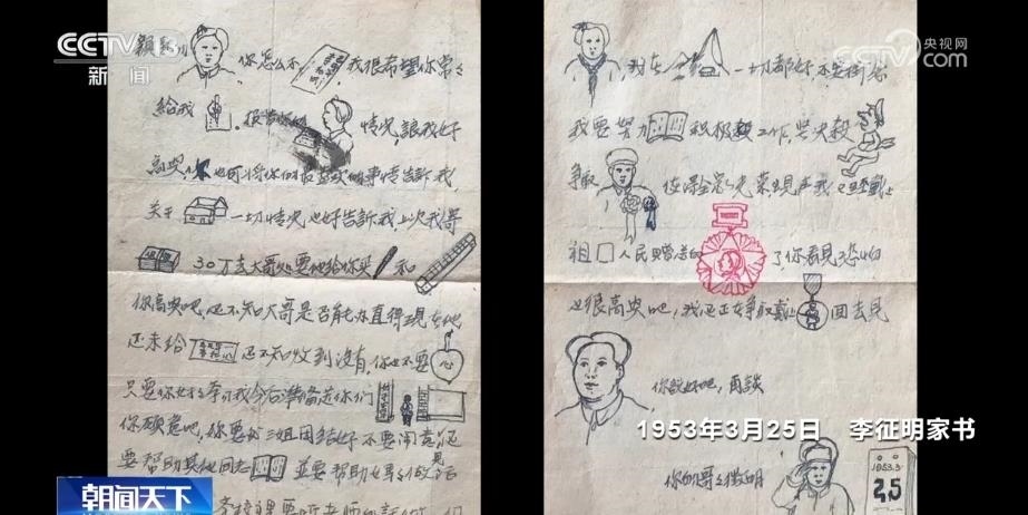 這是一封1953年3月25日從抗美援朝戰(zhàn)場(chǎng)發(fā)往江蘇宿遷的信。在這封戰(zhàn)地家書中,志愿軍戰(zhàn)士李征明為未來的奮斗目標(biāo)做出規(guī)劃。因?yàn)槊妹脗兊哪挲g還很小、識(shí)字不多,李征明擔(dān)心她們看不懂,就在信中畫上了許多圖文并茂的小畫。