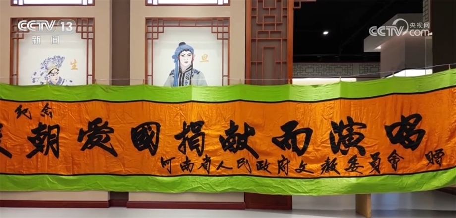 總臺(tái)記者 李恩浩:在河南省戲曲聲音博物館,有這樣一個(gè)十多米的條幅,上面寫著“為抗美援朝愛國捐獻(xiàn)而演唱”,這是香玉劇社義演的第一場(chǎng),河南省人民政府特意為了支持他們的愛國行動(dòng)贈(zèng)送的,當(dāng)時(shí)香玉劇社在全國義演時(shí)它就掛在舞臺(tái)上方。