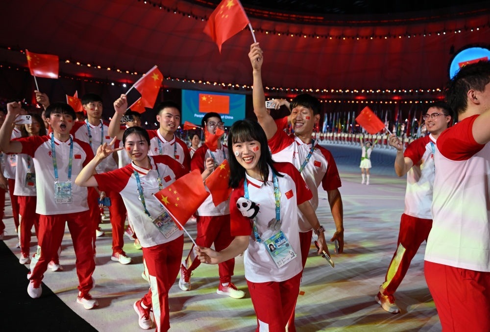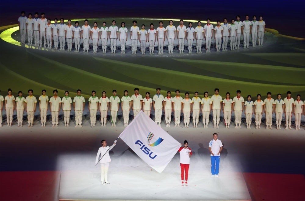 中國大學(xué)生體育代表團在開幕式上入場。