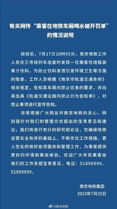 ·南京地鐵通報(bào)女子喝水被開罰單:系果汁,依規(guī)出具告知單。