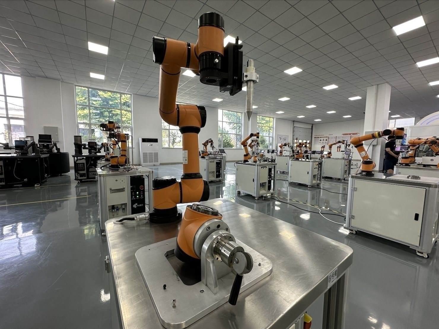 遨博(山東)智能機器人有限公司的六軸協(xié)作機器人,正在演示工業(yè)場景中的模塊組裝