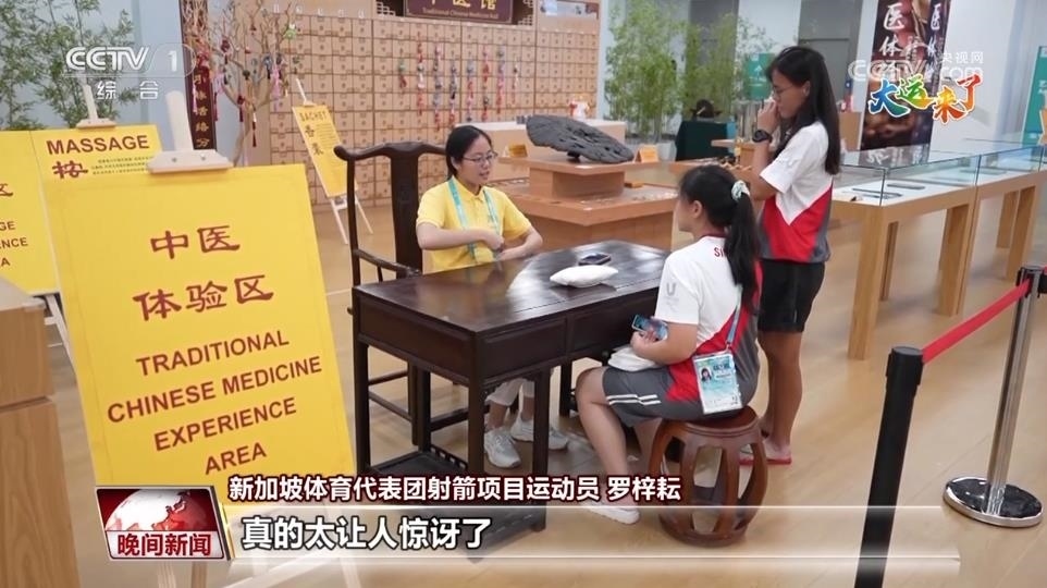走在大運村里面,在很多地方都可以看到一些中醫(yī)文化的元素。比如在這個中醫(yī)體驗區(qū)里就可以了解中醫(yī)古籍,還能感受按摩,甚至能夠在這里進行把脈問診,所以這個區(qū)域也吸引了很多代表團成員和運動員到這里來體驗。