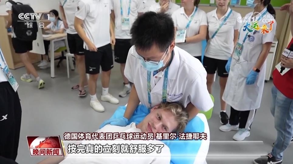 德國體育代表團乒乓球運動員 尼爾斯·霍邁爾:不敢想象在大運村還有這么好的醫(yī)療服務,之前完全沒想到。在德國也有一些診所提供類似服務,但能在這里感受一手的中醫(yī)康復服務,真的太酷了。