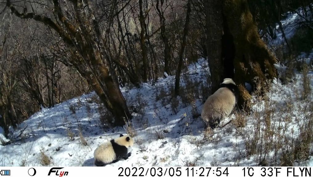 這是2022年3月5日大熊貓國家公園寶興片區(qū)紅外相機拍攝的大熊貓母子畫面。(四川省雅安市寶興縣委宣傳部供圖)